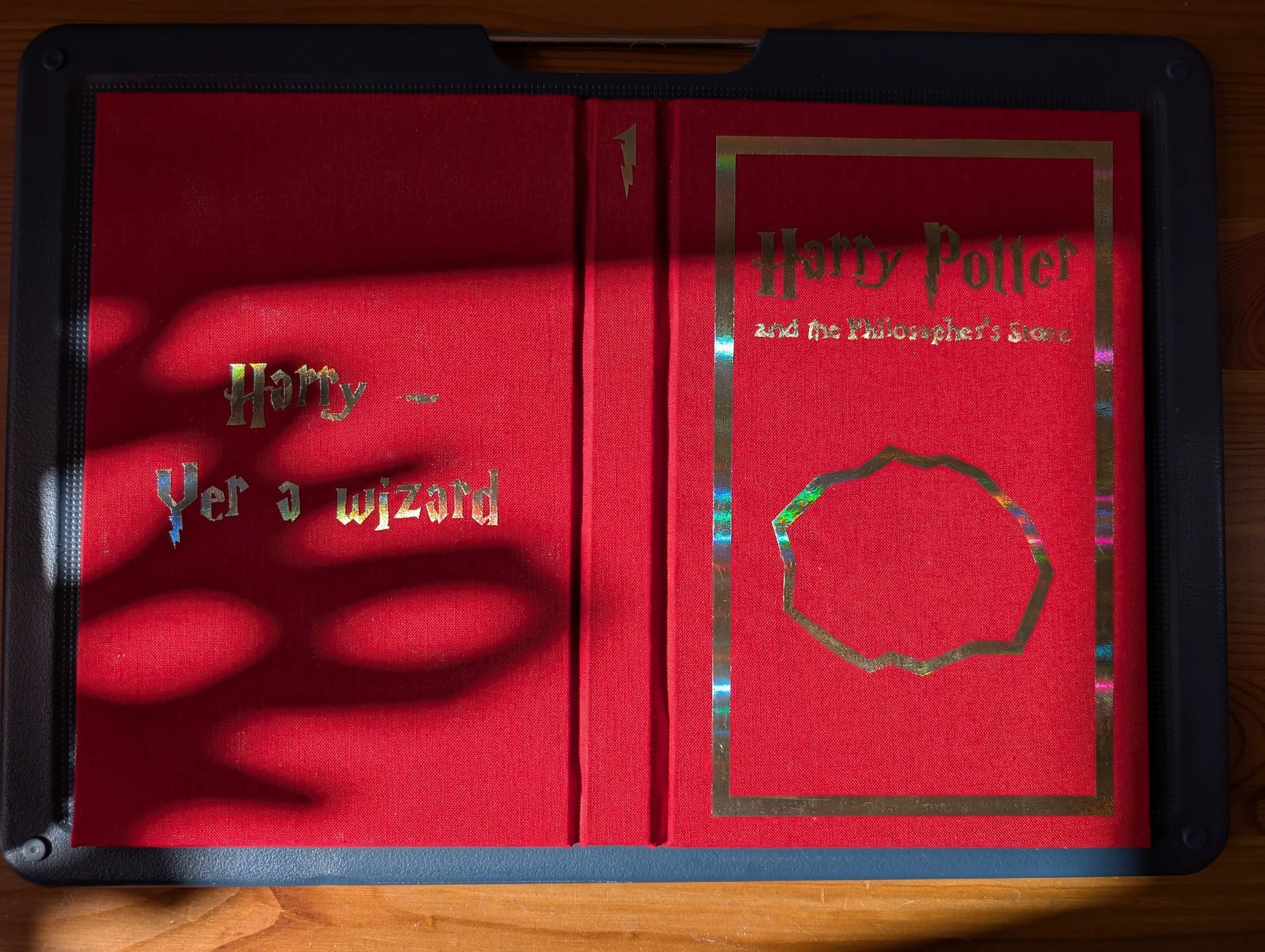 After getting a little taste of bookbinding at school I decided to practice some by rebinding some old books. I bought some used pockets cheap, and tore off the covers, reusing them as bookmarks. Then I rebound them as hardcover books. For this project I used an old copy of the philosophers stone.