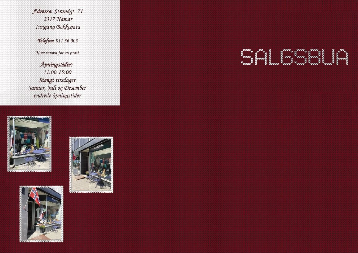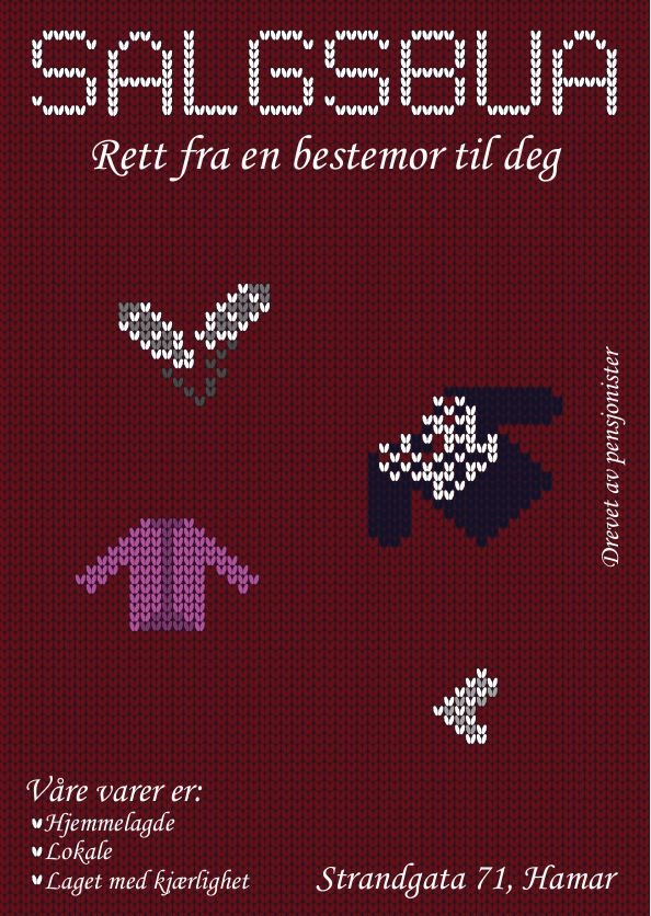 Salgsbua is a little shop in Hamar center driven by grandmas, grandpas and beneficiaries. They sell homemade goods, everything from woodwork, to knitted things, crocheted things, and a lot more. They had no form of a visual identity, and wanted a logo to identify them, some flyers to give out, and some posters to hang up around town.